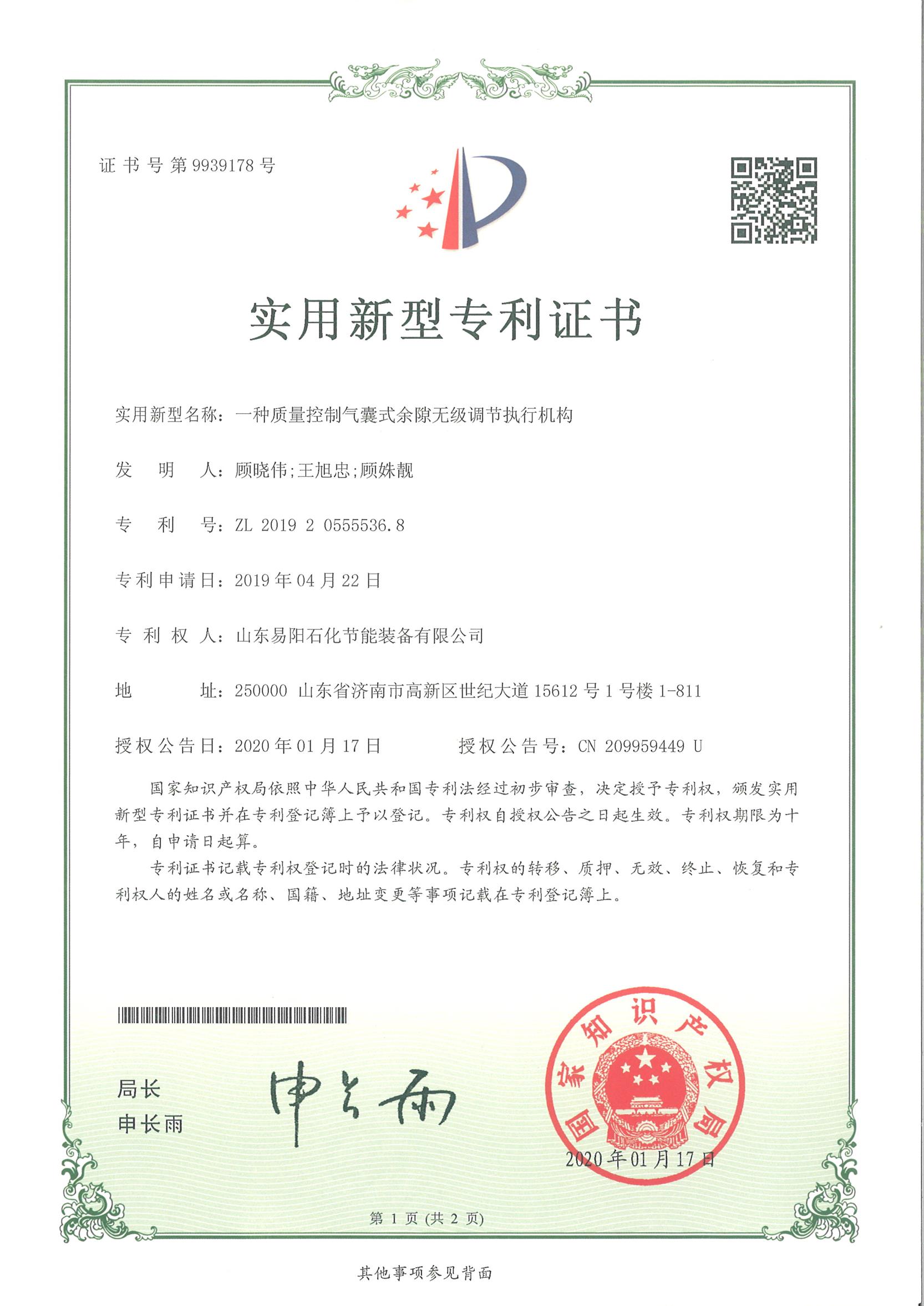 12山东易阳实用新型专利:2020年01月17日,一种质量控制气囊式余隙无级调节执行机构,ZL  2019 2 0555536.8 (顾晓伟,王旭忠,顾姝靓).jpg