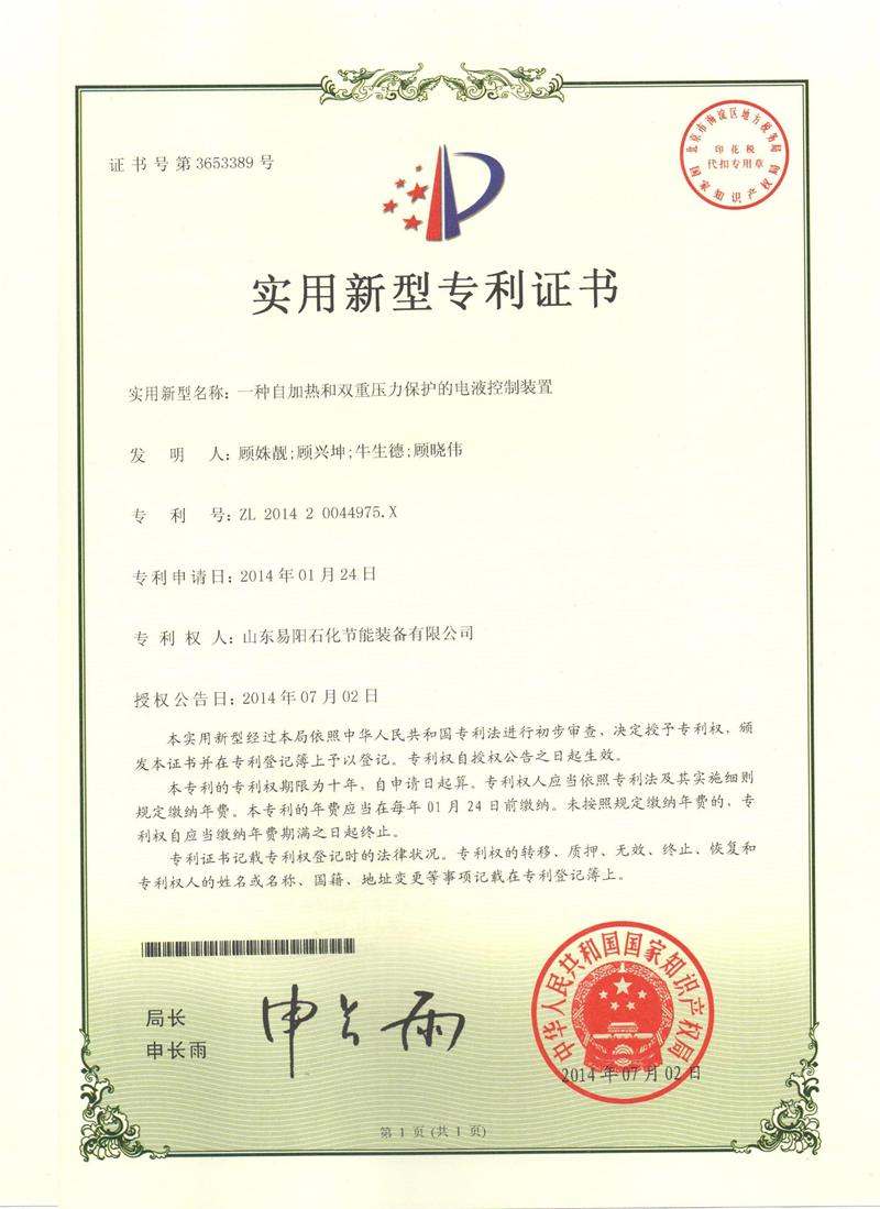 2014年07月02日,一种自加热和双重压力保护的电液控制装置,ZL 2014 2 0044975.X.jpg