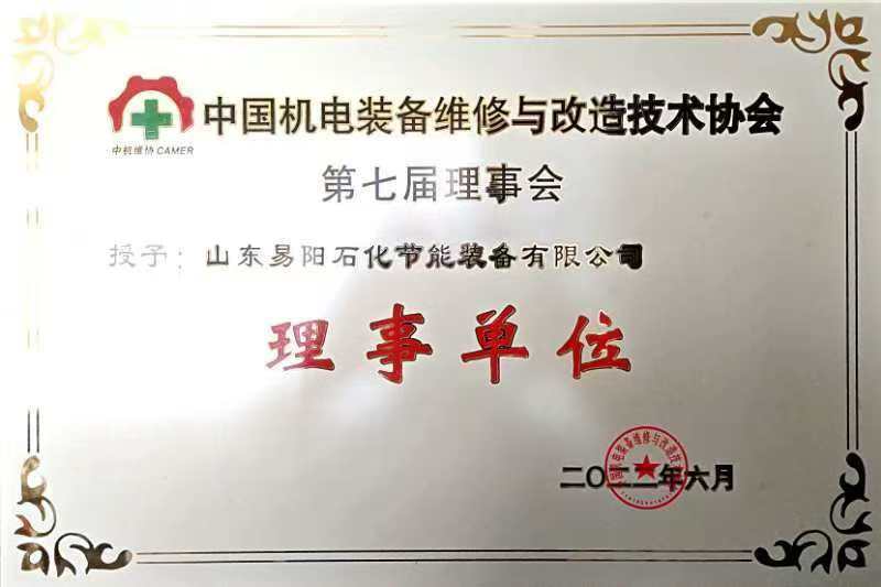 山东易阳石化节能装备有限公司于2022年6月被授予为“中国机电装备维修与改造技术协会”第七届理事会理事单位